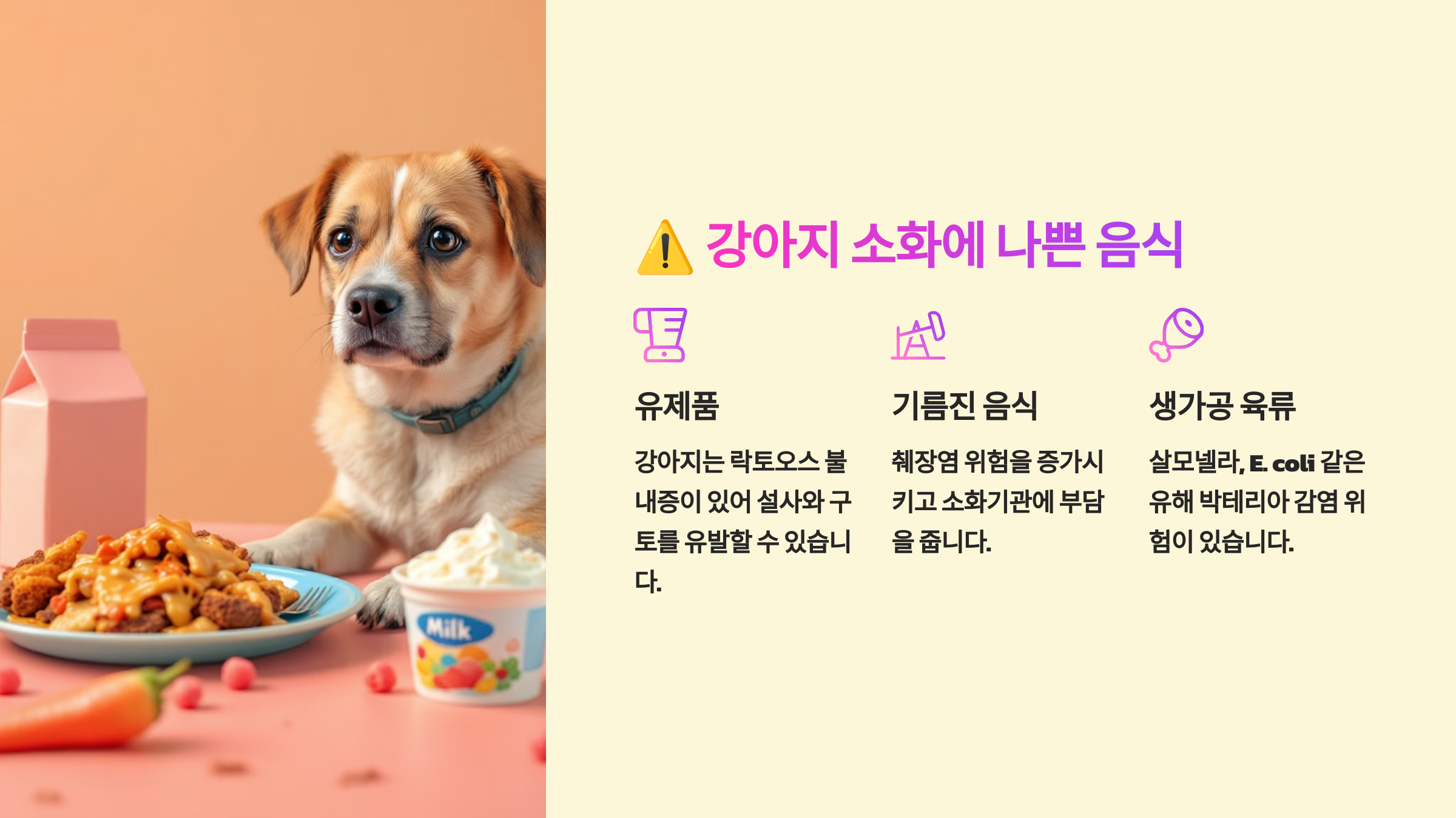 - ❌ 우유 & 유제품: 일부 강아지는 유당불내증으로 설사를 할 수 있어요.