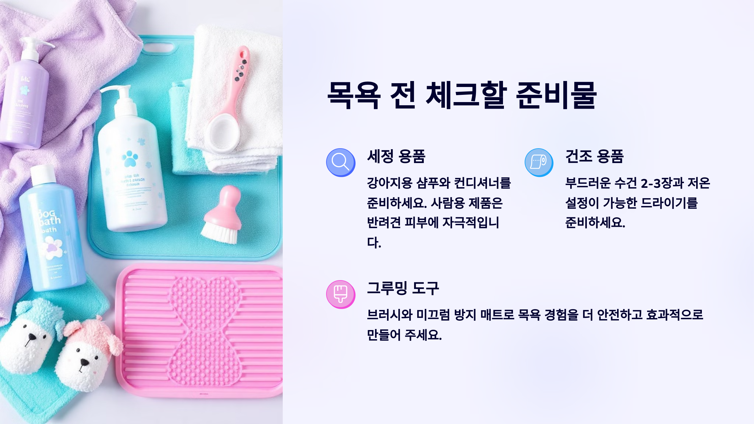 - 강아지 전용 샴푸 - 타월 2장 이상 - 드라이기 또는 펫 전용 드라이룸 - 빗(브러시), 귀마개(면솜) - 미끄럼 방지 매트 - 간식 또는 장난감 - 눈/귀 보호용 티슈 또는 솜