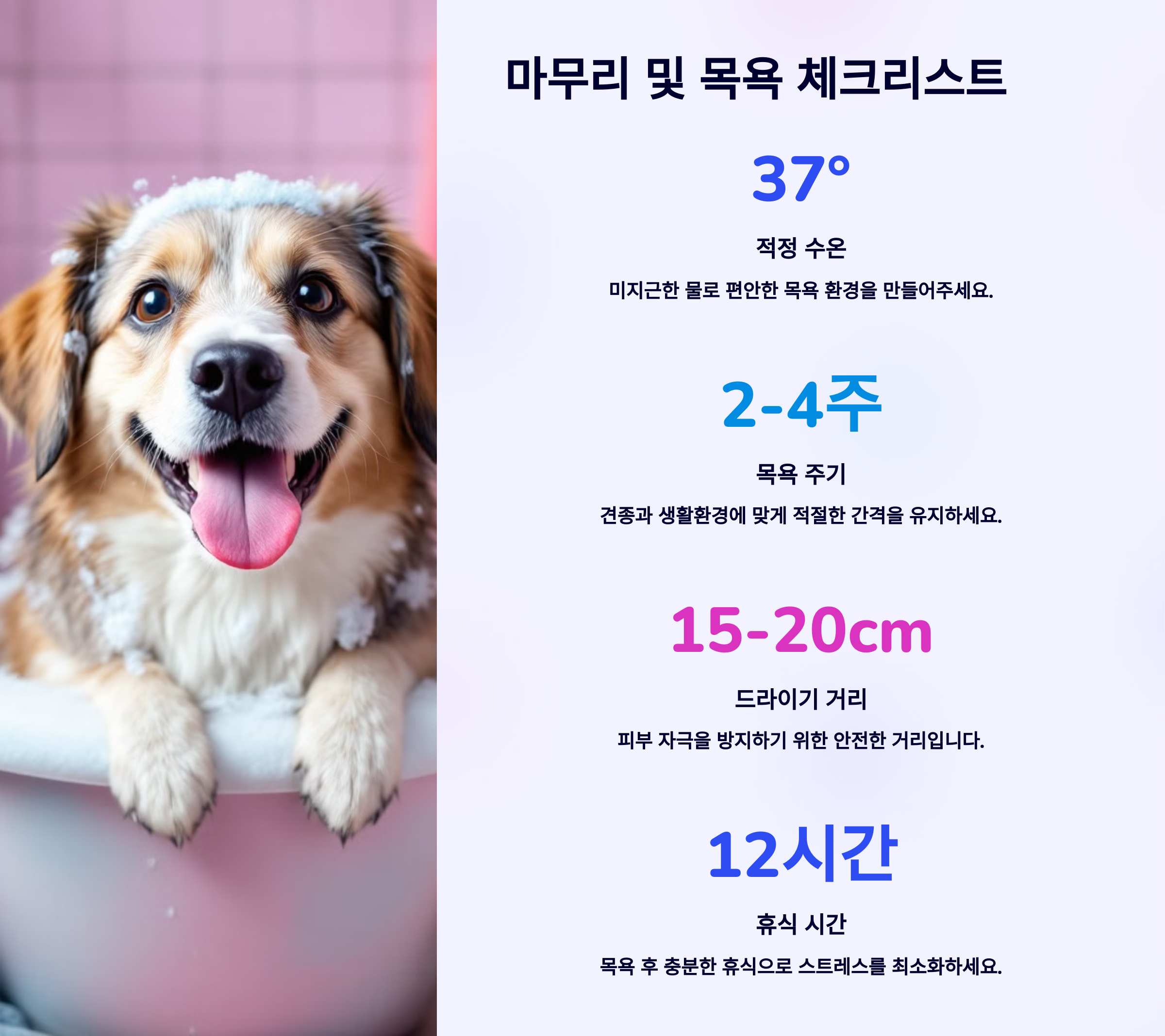 🛁 적정 물 온도는 36~38도 정도가 좋아요. 손등에 댔을 때 따뜻하고 편안한 느낌이면 OK! 특히 어린 강아지는 체온 유지가 어렵기 때문에 더 주의해야 해요.