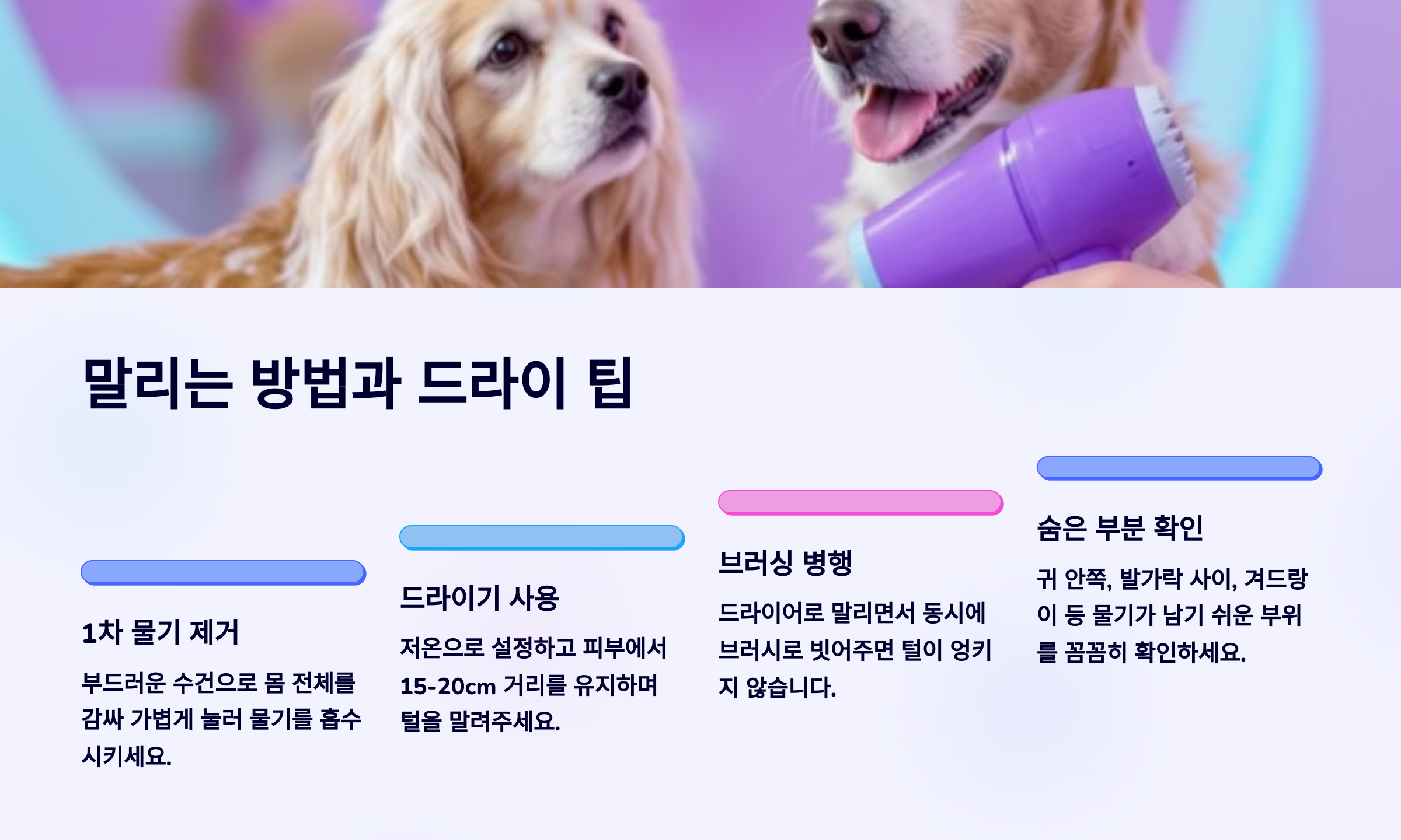 💨 목욕 후 말리기는 샴푸만큼 중요해요! 털이 제대로 안 마르면 피부염이나 곰팡이균이 생길 수 있거든요. 특히 발가락 사이, 겨드랑이, 꼬리 아래는 꼭 건조해줘야 해요.