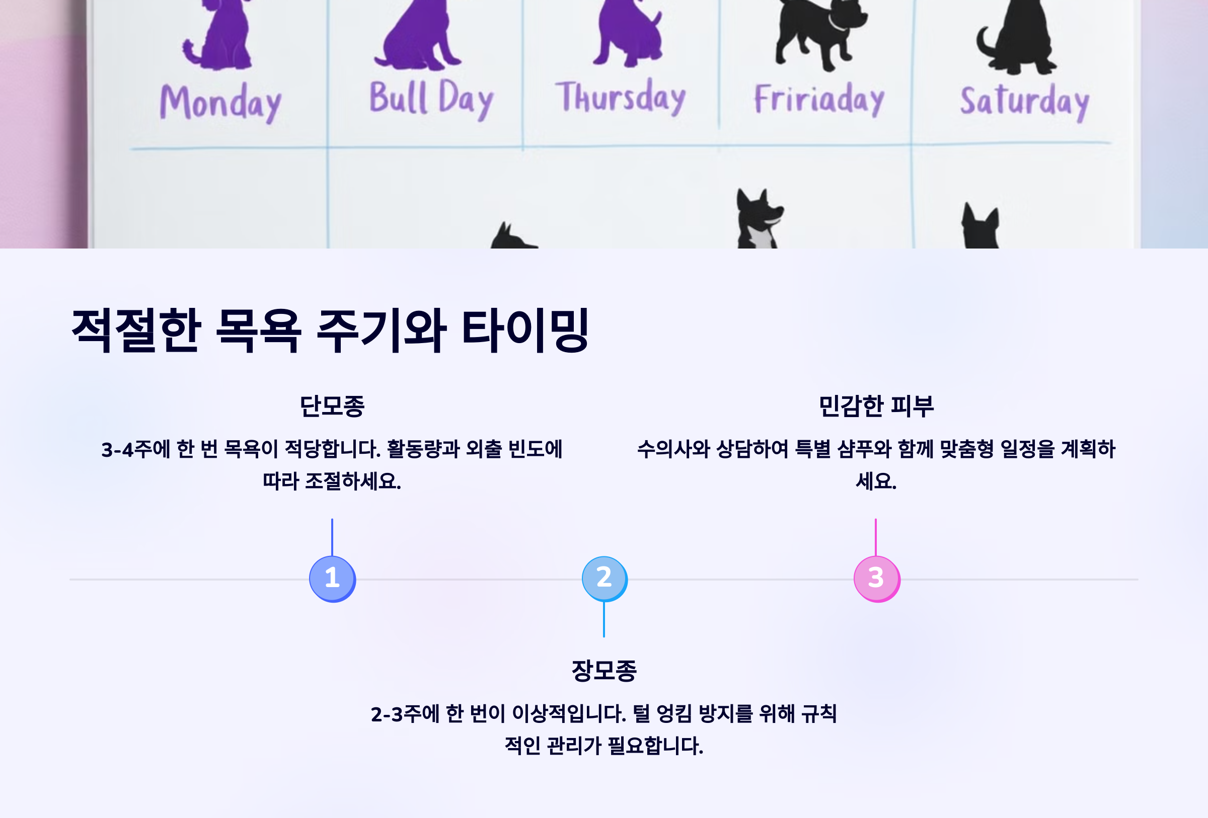 - 일반적인 실내견: 3~4주에 한 번 - 장모종/지성피부: 2~3주 - 피부 질환 치료 중: 수의사 지시에 따름 - 활동량 많은 외출견: 2주 간격