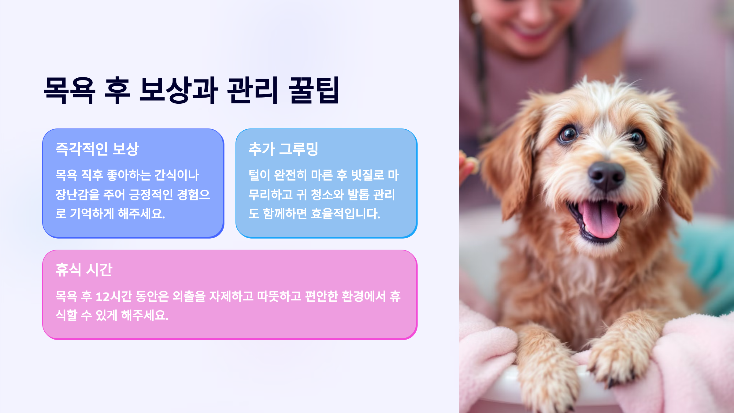🐶 꾸준한 목욕 루틴은 피부 건강에도 좋고, 냄새 걱정도 줄여줘요. 무엇보다, 우리 아이의 자신감을 길러주는 좋은 기회가 될 수 있어요.