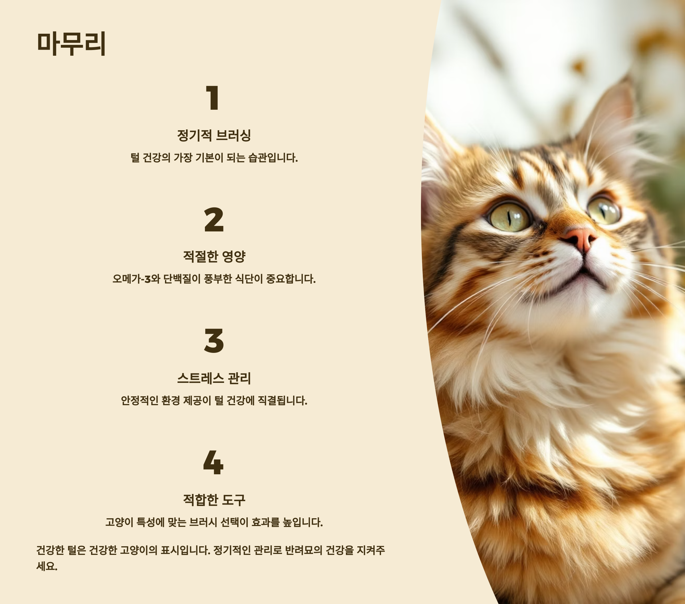 제가 생각했을 때, 털 관리의 핵심은 ‘털을 없애는 법’이 아니라 고양이와 더 편안하게 공존하는 방법을 찾는 거예요. 우리의 일상이 고양이와 함께 더 건강하고 행복해지는 것, 그게 진짜 관리의 목적이 아닐까요? 🧡