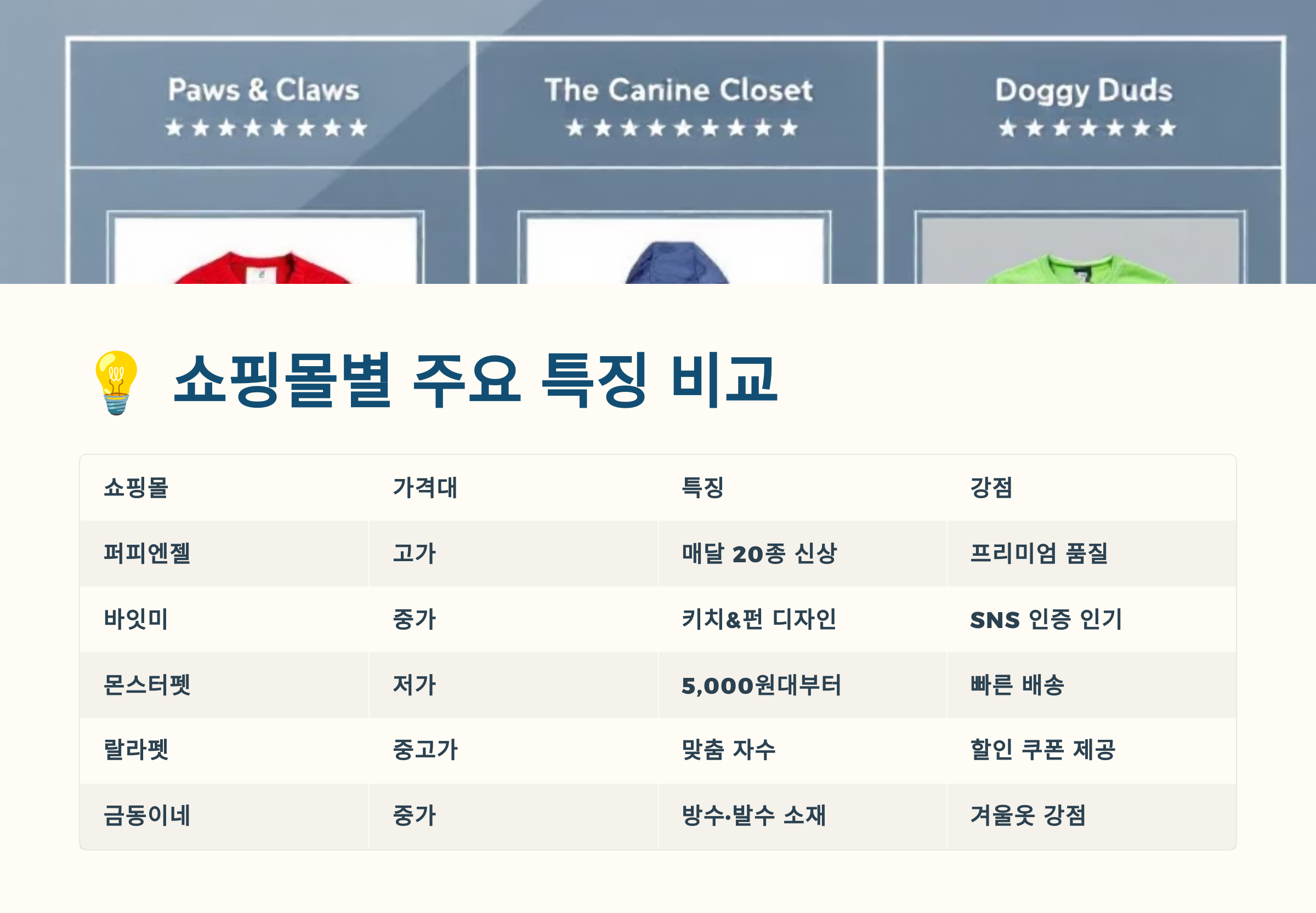 - 🐾 쇼핑몰마다 브랜드 컬러와 인기 아이템이 뚜렷해요!
