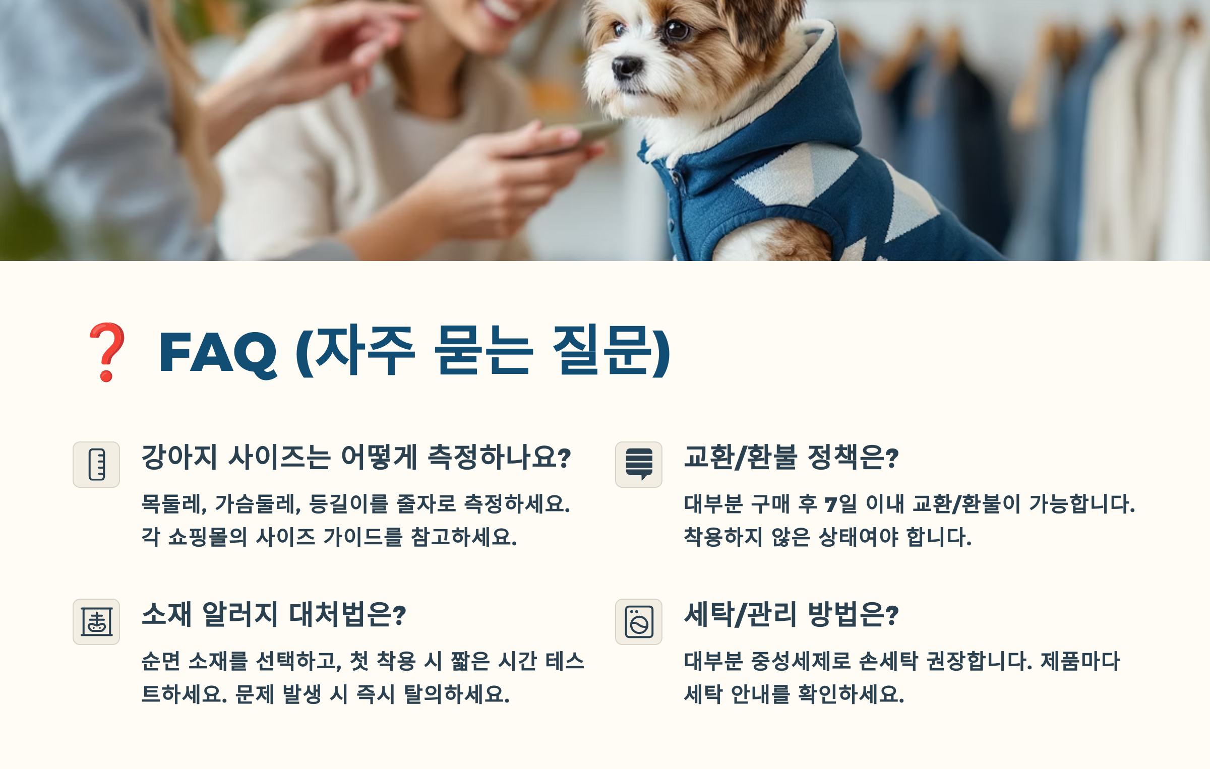 이제 강아지 옷 쇼핑에 필요한 모든 정보를 정리했어요! 마무리로 자주 묻는 질문을 FAQ 형식으로 정리해드릴게요 🙋♂️