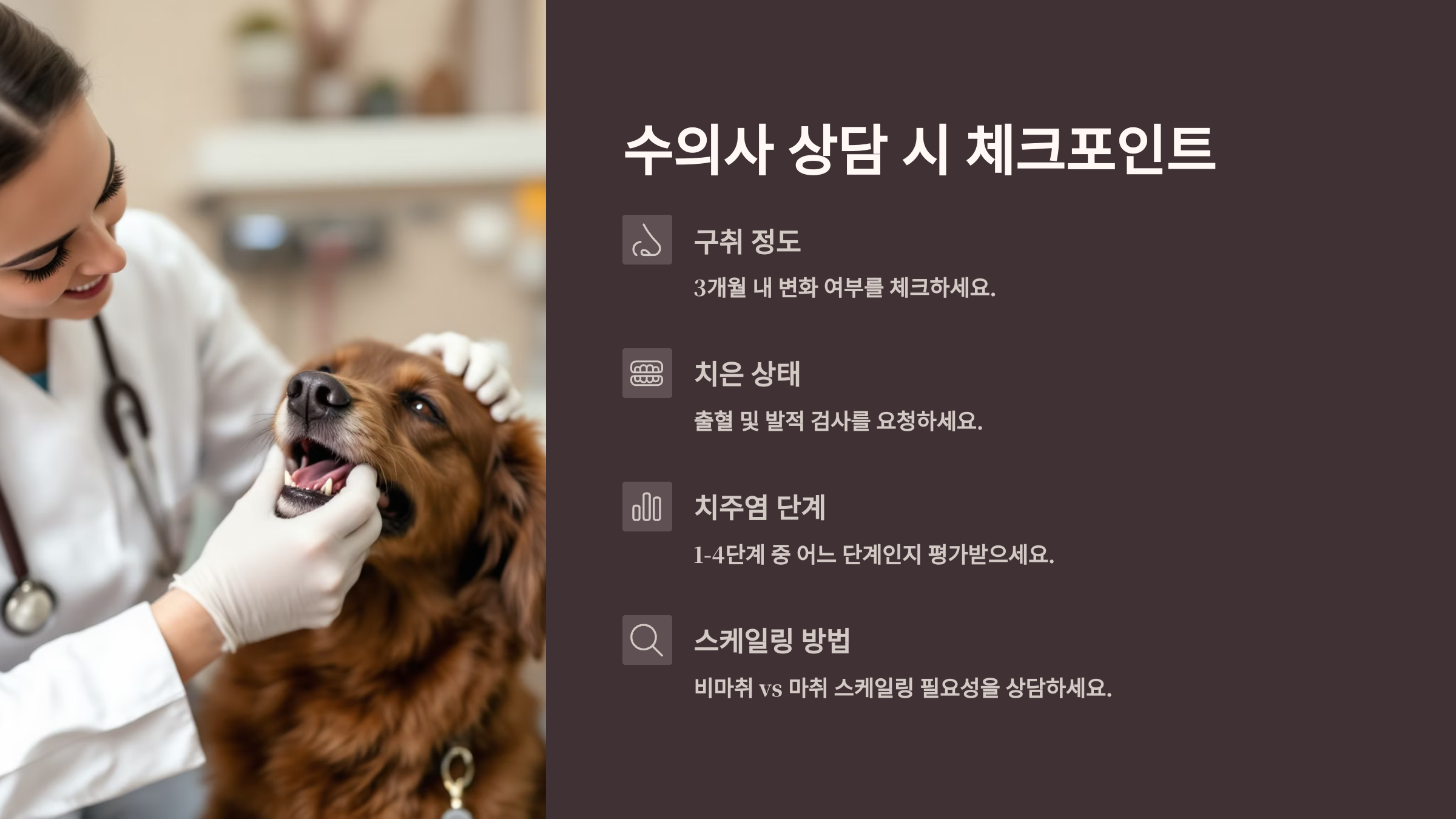 강아지 치석 관리는 수의사와의 협력이 있어야 더 완벽해져요. 단순히 “스케일링 해야 할까요?”가 아니라, 우리 아이의 구강 상태에 맞는 케어법을 함께 찾아야 해요. 😷📋
