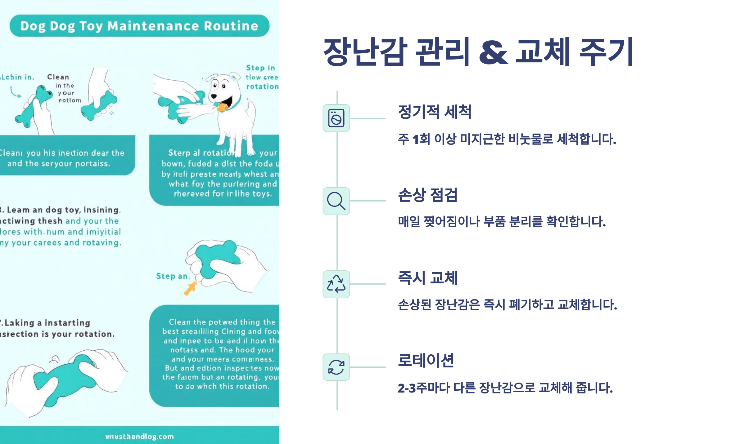 | 고무형 (KONG 등) | 2~3개월 | 갈라짐, 색 변색 시 |