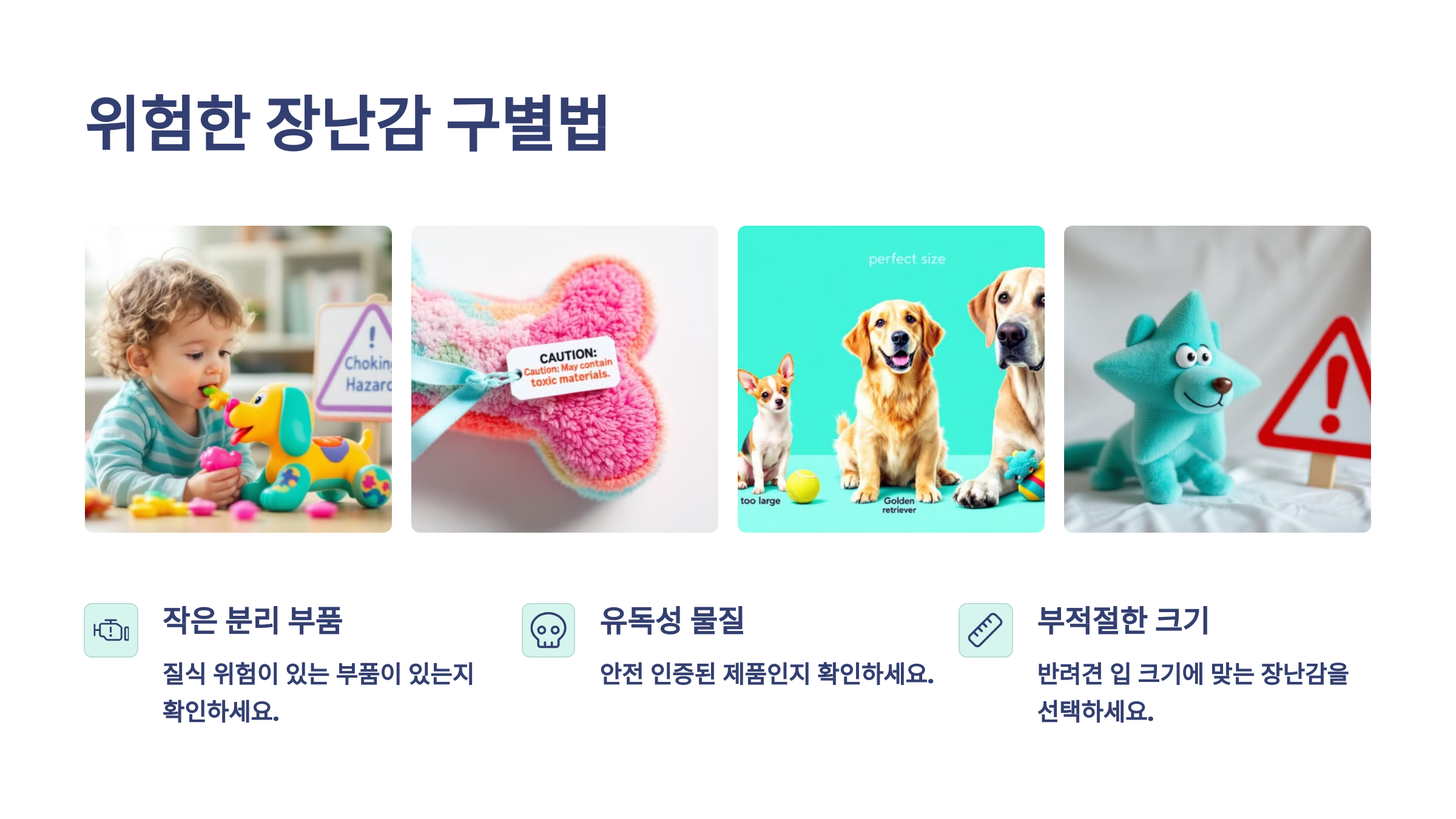 이제 다음 섹션 🚫 위험한 장난감 구별법 겉보기엔 귀엽고 저렴해 보여도, 강아지에게 위험할 수 있는 장난감 유형을 알려드릴게요!