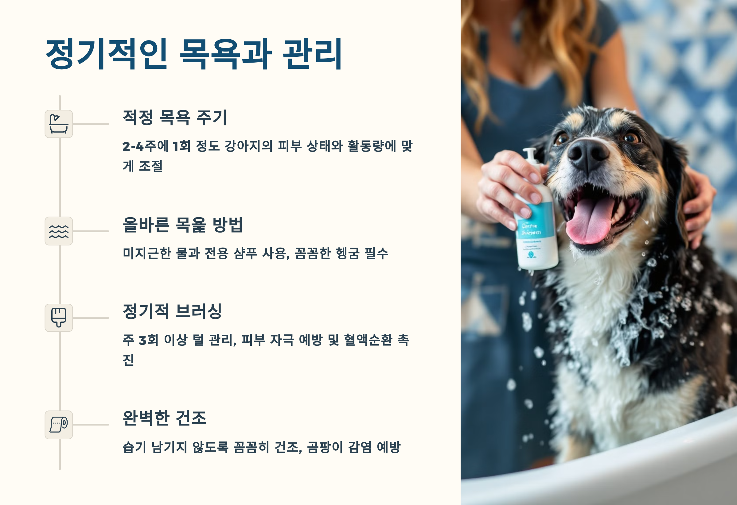 💡 목욕 전에는 빗질을 먼저 해주고, 목욕 후에는 보습제를 발라주면 자극을 줄이고 피부를 촉촉하게 유지할 수 있어요!