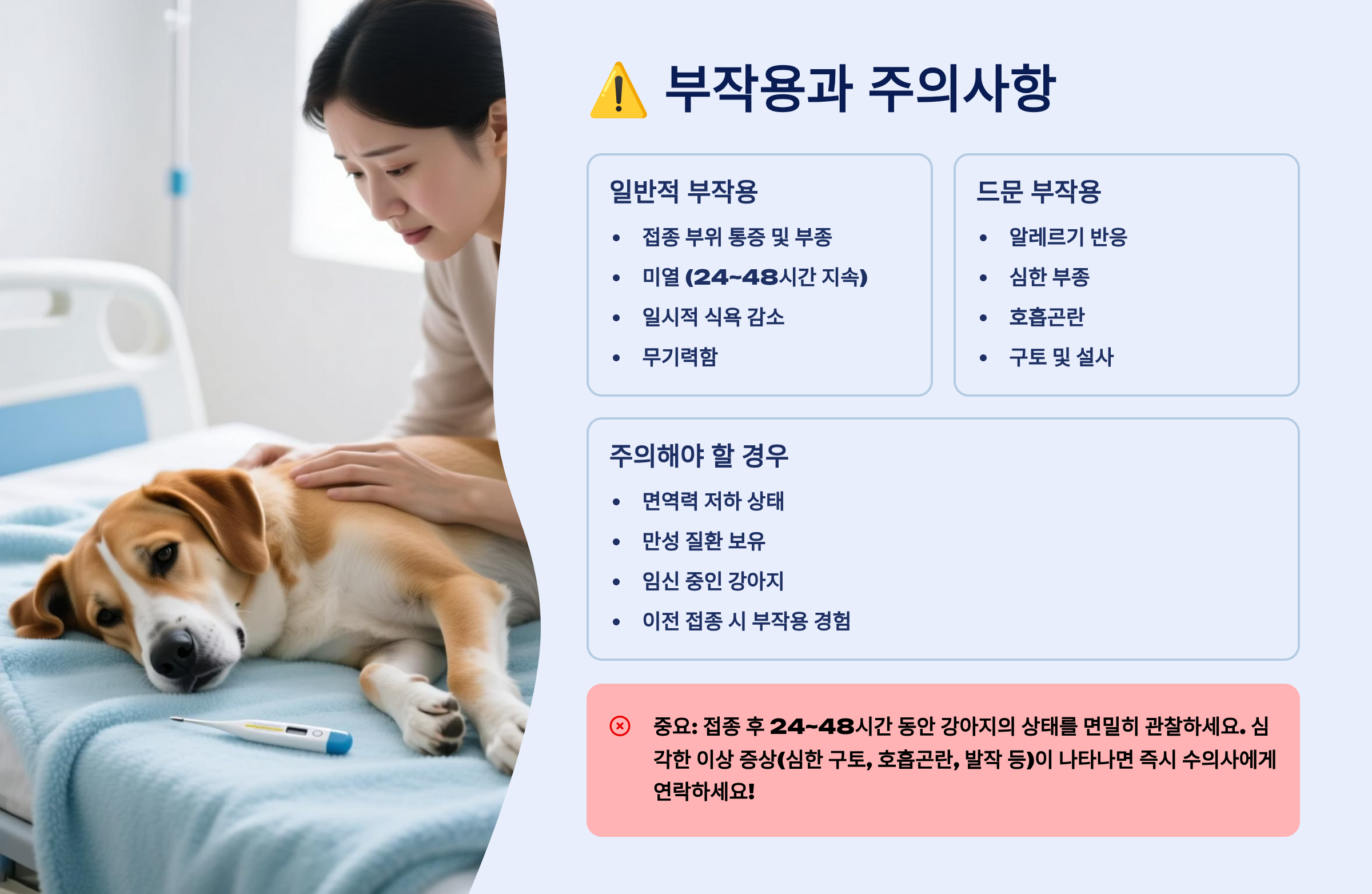 가장 흔한 부작용은 접종 부위의 붓기와 통증이에요. 접종 후 24-48시간 동안 나타날 수 있고, 대부분 자연스럽게 사라져요. 강아지가 접종 부위를 계속 핥거나 긁으려 한다면 넥카라를 착용시켜 주세요. 냉찜질을 해주면 붓기와 통증 완화에 도움이 된답니다.