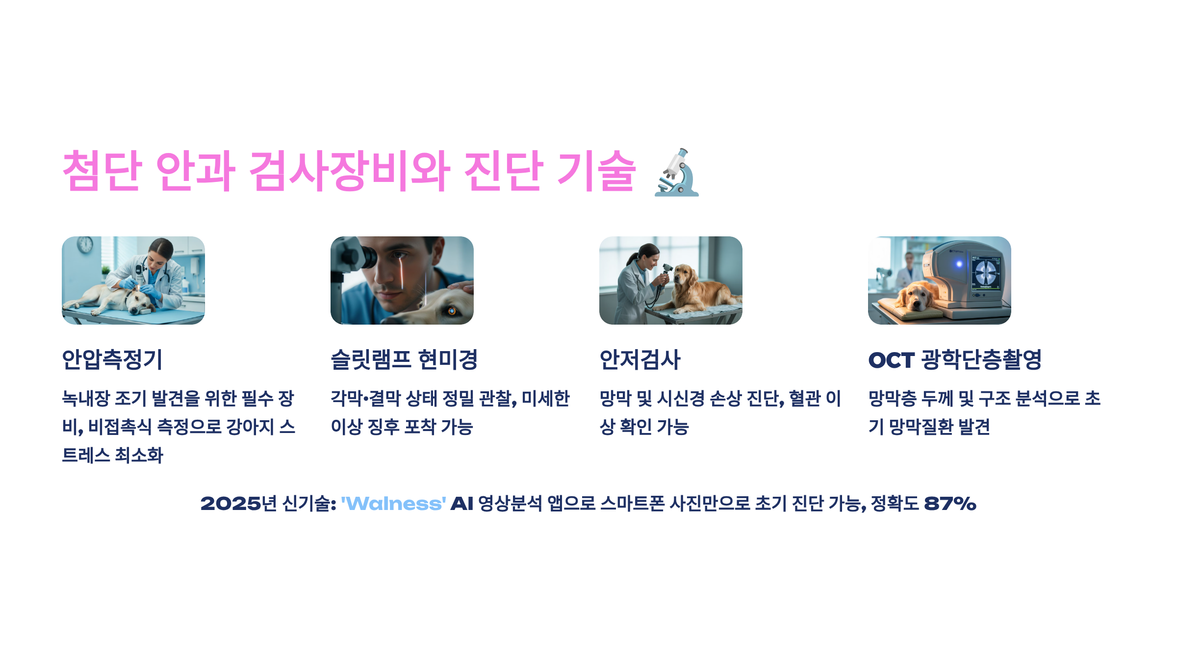 최근 안과 전문병원들의 가장 큰 변화는 첨단 장비 도입이에요. OCT(광간섭단층촬영), ERG(망막전위도검사), 초음파 생체현미경 등 인의용 장비들이 동물병원에도 도입되고 있어요. 이러한 장비들은 육안으로 확인하기 어려운 망막 질환이나 초기 백내장을 정확히 진단할 수 있게 해줍니다. 나는 생각했을 때 이런 첨단 장비의 도입이 반려견 수명 연장에 크게 기여하고 있다고 봐요.